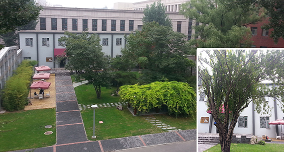 艺文雅苑室外的海棠花园,海棠熏香、紫藤袅袅、丁香微醉,绿荫茂密如织、长廊曲径通幽,特别是书房门前那株稀有的西府海棠,树龄已逾一、二百年,壮实的枝干和茂盛的茎叶预示着生命的内涵与历史的沉淀?;ㄔ爸校固匾馄躺枇巳咎ㄐ菹⑶?,遮阳伞和休闲桌椅设置其上,师生随时落座休憩交流,成为校园中最美的景观。书房命名“悦读生活书房”,英文名称为“Poetical Dwelling”,意取自德国哲学家海德格尔倡导的“人,诗意的栖居”,期待为师生在繁忙的工作学习中提供一方“心灵栖居地”与“梦想起航站”。