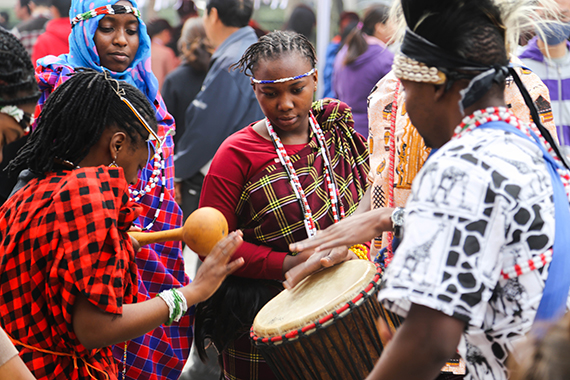 在国际区以各国景点、建筑、文化元素为主题的背景墙下,不同肤色的留学生身着民族服饰展示本土大学、艺术作品、工艺品、音乐、美食等,邀请中国学子体验文化习俗,为嘉年华带来精彩的全球风光和异域文化的别样风情。