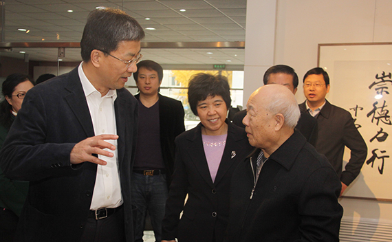 我校校长怀进鹏院士、北京市委教育工委副书记郑萼与欧阳中石先生亲切交流 余 敏/摄影