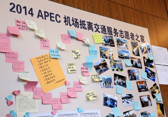 北航志愿者负责机场交通信息咨询、摆渡随车等服务工作,值守在国门第一关。他们是此次会议周服务时长最长、范围最广的志愿者,每天都满怀激情地投入到迎来送往的工作中。他们每天随车行驶在九条规划线路上,从初期将外宾送抵沿线各大酒店,到后期重心逐渐转移到送机工作,整只队伍负责了24小时全天候的机场接送任务。“连日来,这九条线路图以及其经过的29家酒店已经印在了我们每位交通组志愿者的脑海里成为难以磨灭的‘独家记忆’。我们写下我们对APEC的承诺与信念,花花绿绿的贴纸伴着遒劲的字体成为我们五彩的青春宣言。”志愿者孟峻宇如是说。