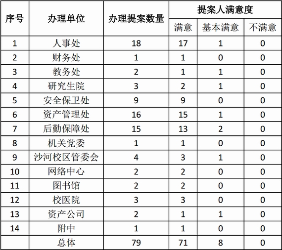 本年度教代会共收到代表提案110件,全部得到了相关职能部门的办理或答复,做到了“事事有回复,件件有着落”。其中79件予以立案的提案,已全部在本年度之内办理完成,提案人对提案办理的满意度达100%。