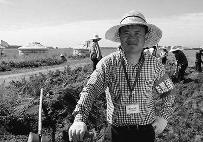 站在沙丘上,黄色的毡帽下,黑红的脸膛和质朴的笑容,使这个49岁的汉子看起来像一名当地的牧民。