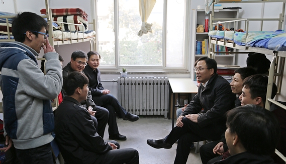 徐晓书记一行首先来到学生公寓,走进学生宿舍与寒假留校的本科生代表进行了亲切交谈,详细了解了同学们的学习、生活和家庭情况,给同学们送上了新春的祝福。徐晓书记还与同学们分享了自己在大学期间的往事,与同学们交流关于大学生创业和就业等热点话题,座谈氛围轻松而温馨。他勉励同学们要牢记习近平总书记对当代大学生的嘱托,时刻不忘当代大学生所肩负的责任。同时,他也希望同学们在大学期间积极参与课外体育锻炼,提高身体素质。