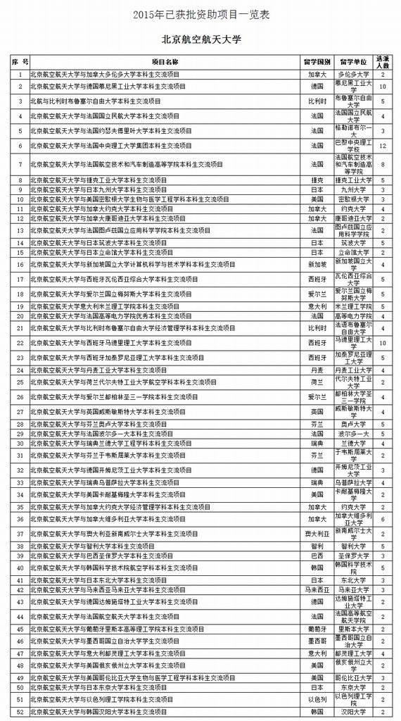 北航新闻网2月15日电(通讯员 高源) 日前,我校与德国达姆施塔特工业大学、美国哥伦比亚大学等10个本科生交换项目新获批立项,新增本科生公派留学全额奖学金名额37个。我?;衽?ldquo;优秀本科生国际交流项目”总数达到52个,每年国家奖学金资助名额高达203人,位列全国第二。
