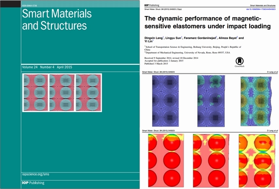 北航新闻网4月23日电(通讯员 李立军) 刚刚出版的智能材料与结构期刊《Smart Materials and Structures》(多学科材料领域Q1区刊物)以“封面文章”刊发了北航交通科学与工程学院博士研究生冷鼎鑫作为第一作者、指导教师孙凌玉教授作为通讯作者,与美国内华达州立大学雷诺分?;笛г篎aramarz Gordaninejad教授合作的研究成果:“The dynamic performance of magnetic-sensitive elastomers under impact loading”。此项成果为智能材料的试验设计和性能研究提供了全新的方法,加快了磁流变弹性体新型智能材料的工程应用速度。该论文一经刊出就被国内外学者多次检索下载。