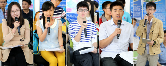 此次交流活动在沙河校区“动力梦工场”——能源与动力工程学院学生科技创新实践场地举行。2014年北航大学生年度人物(自强自立之星)、金质奖章获得者、电子信息工程学院2011级本科生冯晴晴,北京市“红色1+1”一等奖社会实践队代表、材料科学与工程学院2012级本科生黄程程,创业学生代表、速感科技(北京)有限公司创始人兼CEO、计算机学院2011级本科生陈震,蓝天志愿者协会会长、自动化科学与电气工程学院2012级本科生欧天华,学生助理、交通科学与工程学院2013级本科生陈铁昊先后围绕青春与奋斗、红色“1+1”活动给我的启示、创业之路、志愿服务与个人成才以及对学校发展的建议等做了交流发言。