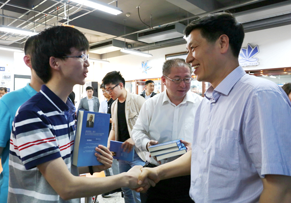 徐校长首先祝贺同学们“五四”青年节快乐。他在接下来的讲话中指出,学校管理有两个中心,一个是学生,一个是老师。对于教学来讲,只有一个中心,那就是学生。徐校长在谈起高镇同、钱士湘、李哲浩等老教授捐资助学的“爱的传递”感人事迹之后指出,我校的许多老教授虽然不富有,但都把对学生的爱放在最重要的位置,要实现爱的传递,把关爱学生、倾心育人的文化传承下去。改革开放30多年来,中国和北航都取得了令人瞩目的成绩,今后30年,一定要在同学们手上,把中国、把北航建设得更好。最后,徐校长向在场的每一位同学赠送了《量子理论——爱因斯坦与玻尔关于世界本质的伟大论战》一书,鼓励同学们坚持追求真理,不断探索未知世界,珍惜时光,把握青春,向着一名伟大科学家的目标前进。徐校长强调,只有培养出伟大的人才,北航才能真正成为一所伟大的大学。