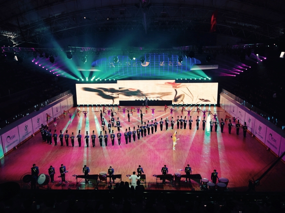 5月2日下午,我校学生行进管乐团在复旦大学正大体育馆参加行进管乐展演大学组的比赛。全新修改的方案凭借乐队富有中国特色的动人旋律、惊艳的旗舞与舞蹈表演完美地诠释了梁山伯与祝英台相识、相爱、身死、化蝶的感人故事,得到了在场评委的一致好评,赢得了观众和其他团队的阵阵喝彩,最终技压群芳收获大学组金奖第一名。