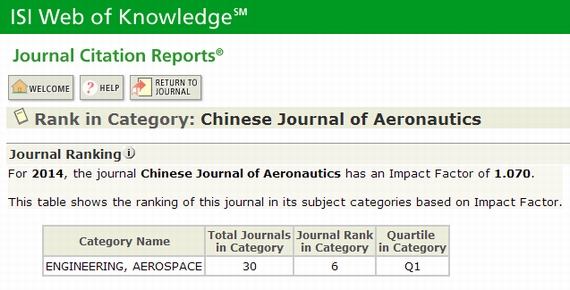 北航新闻网6月23日电(通讯员 蔡斐) 根据美国SCI数据库JCR(期刊引证报告)2015年6月19日发布的最新数据,我校主办的期刊Chinese Journal of Aeronautics(《中国航空学报》英文版,简称CJA)影响因子突破1,达1.070,与去年相比增幅达55.3%,被引频次增幅达70.36%,影响因子位居SCI-Aerospace Engineering学科第6位,在亚洲地区排名第一,跃入Q1区。全球航空航天顶级老牌期刊Journal of Guidance Control & Dynamics和AIAA Journal影响因子分别为1.291和1.207,分别位居第3与第4。