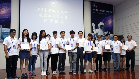 闭营仪式一开始即播放了夏令营营员们精心制作的短片,让全体营员通过视频回顾了整个夏令营的精彩活动。随后,港澳台办公室马进喜主任致辞,他对全体营员的热情参与表示感谢,他表示,“航空航天夏令营”七年来连续举办,得到了一千多名京港澳台学子的参与,为增进海峡两岸暨香港、澳门青年航空航天知识、加深沟通和了解起到了重要的作用,他希望全体营员以夏令营为起点成为永远的朋友,共同为海峡两岸暨香港、澳门交流合作贡献力量。成功大学航太系崔兆棠教授在致辞中对我校做出的细致安排和悉心招待表示感谢,他寄语所有营员要珍惜此次夏令营难得的经历和体验,在共同的中华文化中谱写精彩的人生。随后,我校张奇同学和香港大学郑诗莹同学作为夏令营学生代表发言,表达了他们参与本次夏令营的感悟和体会,获得了全场营员的共鸣。仪式最后,马进喜主任和港澳台高校教师共同为营员代表颁发了纪念证书。