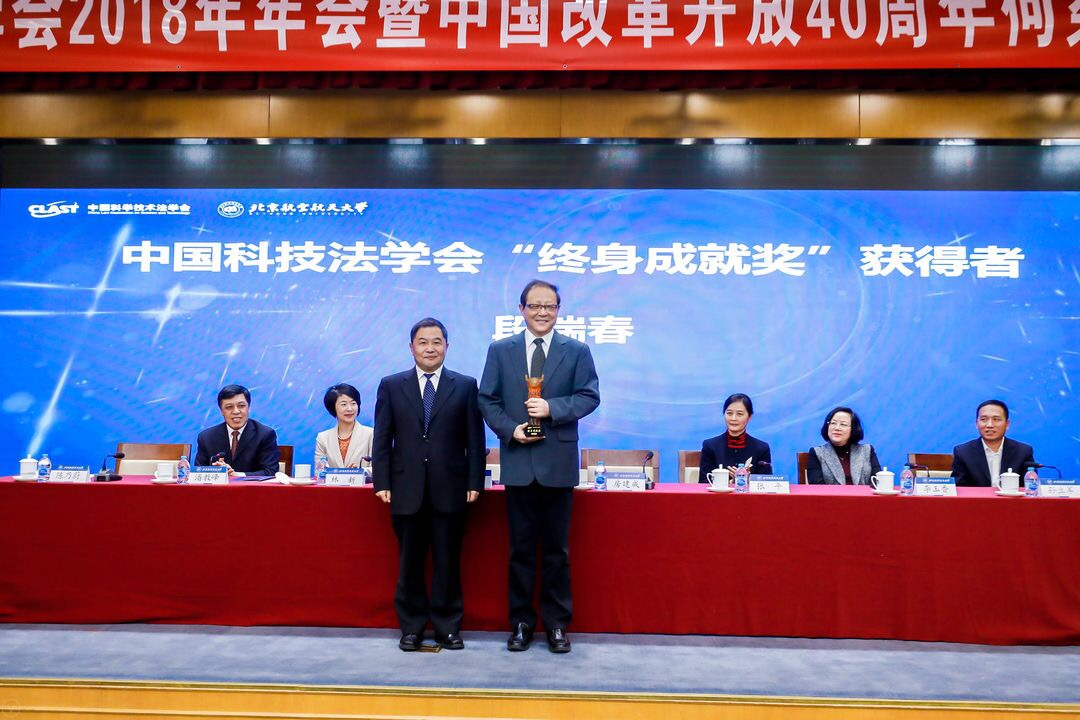 随后,段瑞春发表了饱含深情的获奖感言。他首先感谢评选委员会和与会嘉宾对自己的信任,之后回顾了中国科学技术法学会成立30年的发展历程,并作为亲历者,向大家分享了参与我国《技术合同法》、《科学技术进步法》等多部科技立法的经历与感受,畅想了新时期学会面临的光荣使命与重大机遇,最后,他祝愿学会在中国法学会的正确领导下和房建成会长的带领下不断取得新的更大的成绩。