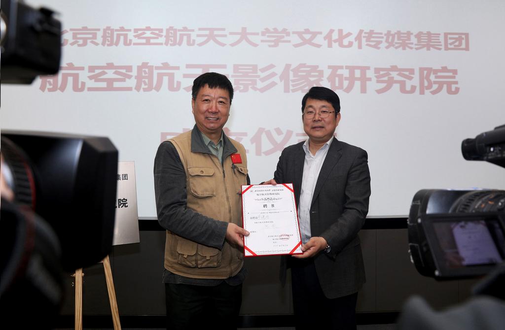 刘小龙向牟健为颁发北航文化传媒集团航空航天影像研究院院长聘书、向北京航空航天大学新闻中心副主任余敏颁发北航文化传媒集团航空航天影像研究院副院长聘书。