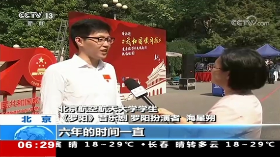 【同期】北京航空航天大学学生 《罗阳》音乐剧 罗阳扮演者 海星朔:激励我们每一名北航的学生能够学习他的这种精神,六年的时间一直在演出这部音乐剧,每演一次我觉得实际上对我都是一种激励,就是真正的把航天报国当成自己的一个理想和志向。