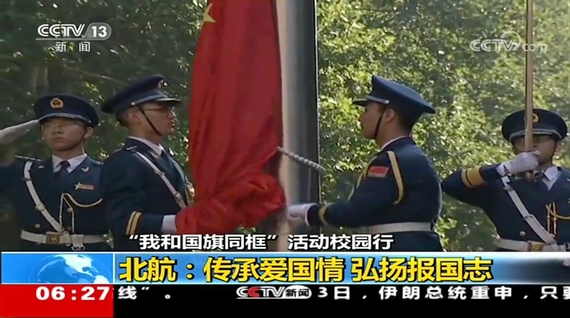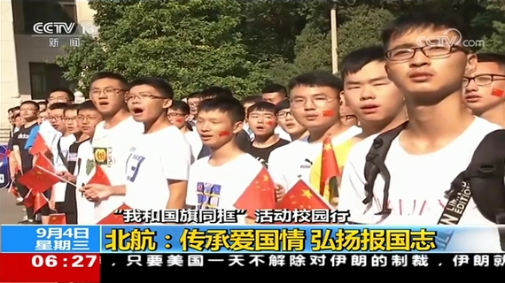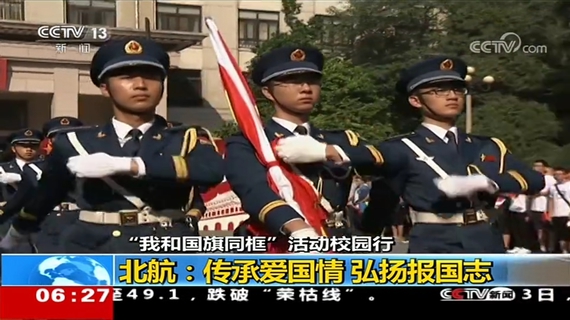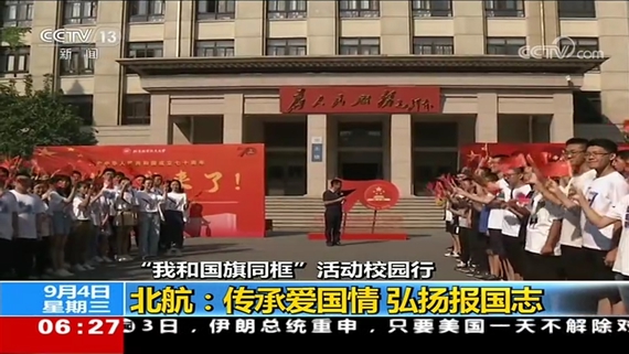 【主持人】昨天(3日),由中央广播电视总台新闻新媒体中心发起的“我和国旗同框” 活动校园行来到北京航空航天大学,从七旬老教授到00后新生,他们和国旗同框,以升旗仪式、歌舞快闪等方式,祝福伟大祖国,传承爱国之情,弘扬报国之志。