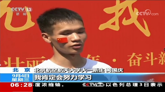 【同期】北京航空航天大学大一新生 蔺国庆:今年是祖国(新中国)70华诞,我自己也十八岁了,进入北航,是我自己的成人礼,在这个新的起跑线上,我肯定会努力学习,青年强则国强,我们进步,国家也会在进步。