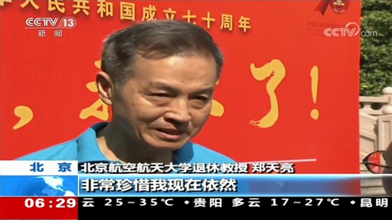 【同期】北京航空航天大学退休教授 郑天亮:能够跟共和国的前进的步伐同步发展,我感到非常得荣幸,我非常珍惜我现在依然还能够站在科技的最前沿,为国效力。我希望我们的学子要立下为国奋斗的这样一个远大志向,让祖国的明天更加美好。