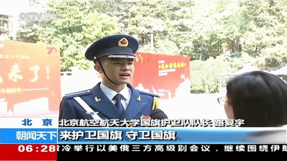 【同期】北京航空航天大学国旗护卫队队长 路复宇:我们今天(3日)的活动的意义是特别大的,可以召唤更多的人来护卫国旗,守卫国旗。不要求大家每天都早起升起国旗,但是希望大家每天都能在自己的心里升起它。