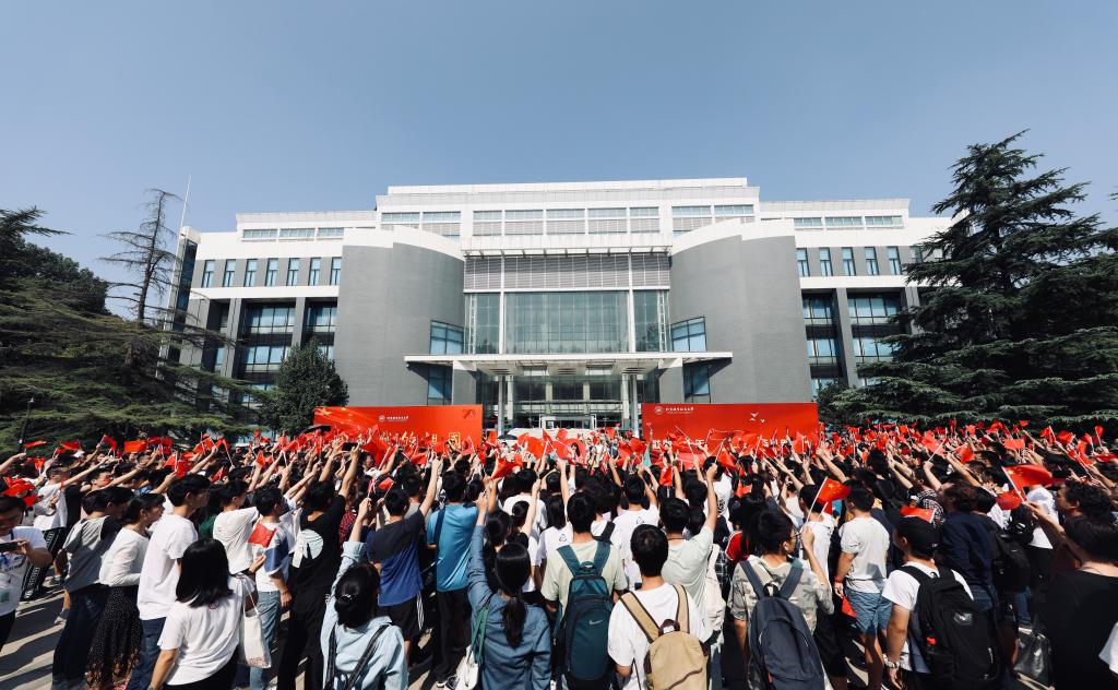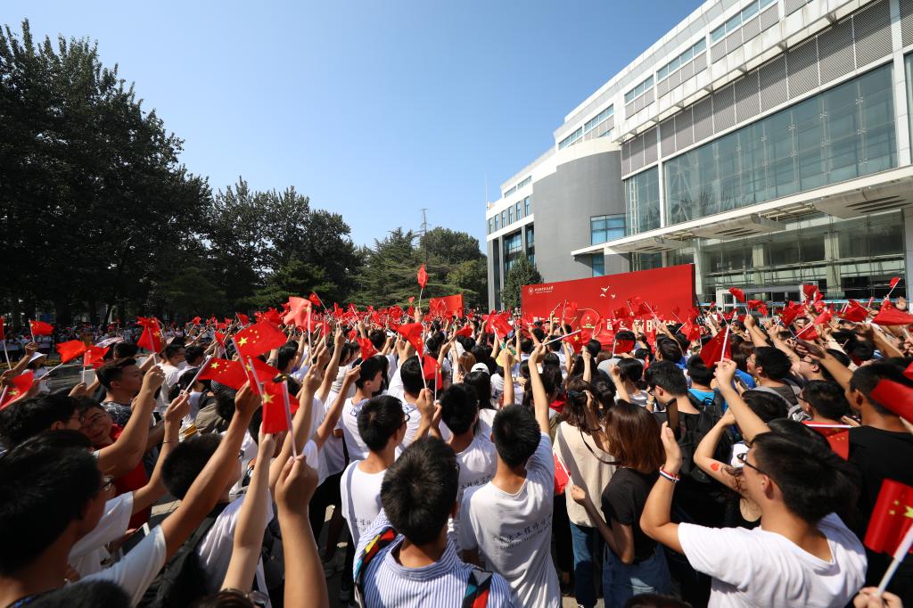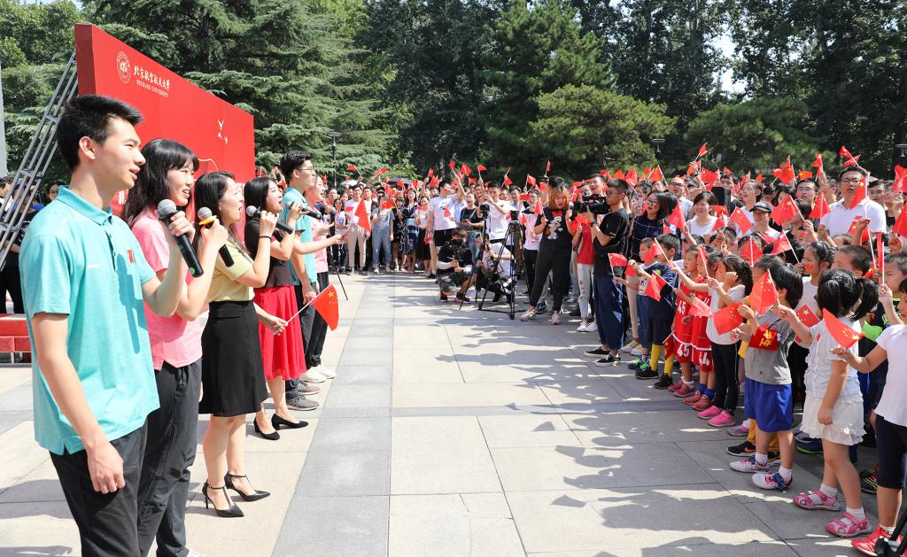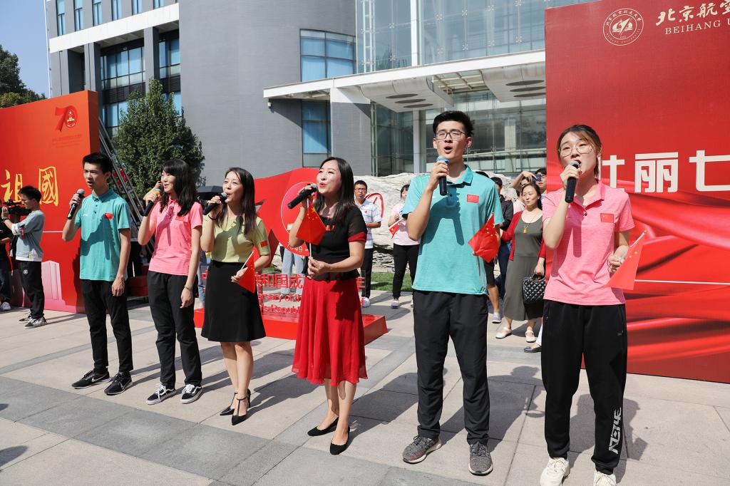 越来越多的师生围聚过来,拿出手机边拍摄边参与其中,大家纷纷挥舞着手中的国旗,跟着领唱人员专注地歌唱,现场顿时变成一片“红色海洋”。动人的旋律响彻校园,诉说着每一名北航人对祖国的无限热爱与祝福。