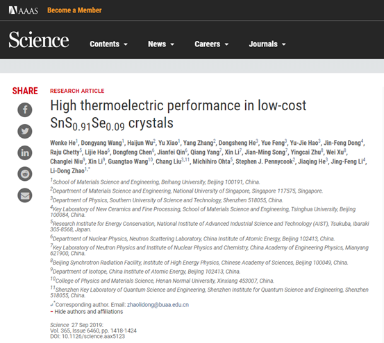 北航新闻网9月27日电(航宣)2019年9月27日,《Science》杂志在线以全文Article的形式发表了北京航空航天大学材料科学与工程学院赵立东教授课题组在热电材料研究上取得的新进展:《High thermoelectric performance in low-cost SnS0.91Se0.09 crystals》,发现并利用硫化锡(SnS)的多个能带随着温度的演变规律,通过引入Se优化调控了有效质量和迁移率的矛盾,在储量丰富、成本低廉、环境友好的SnS晶体材料中实现了高的热电性能 (Science 365 (2019) 1418-1424.)。