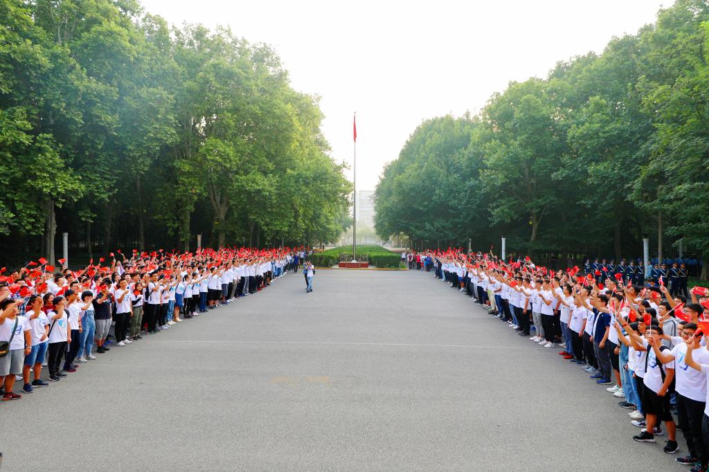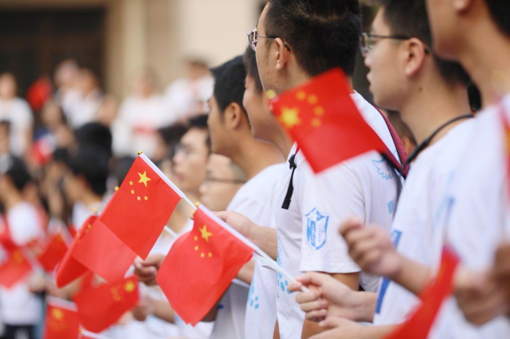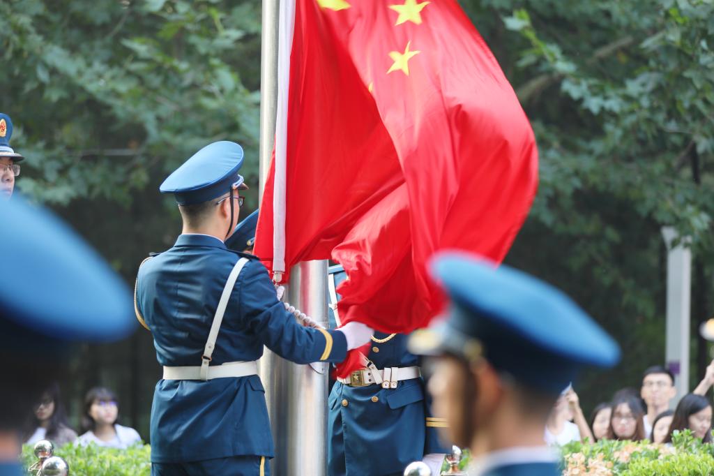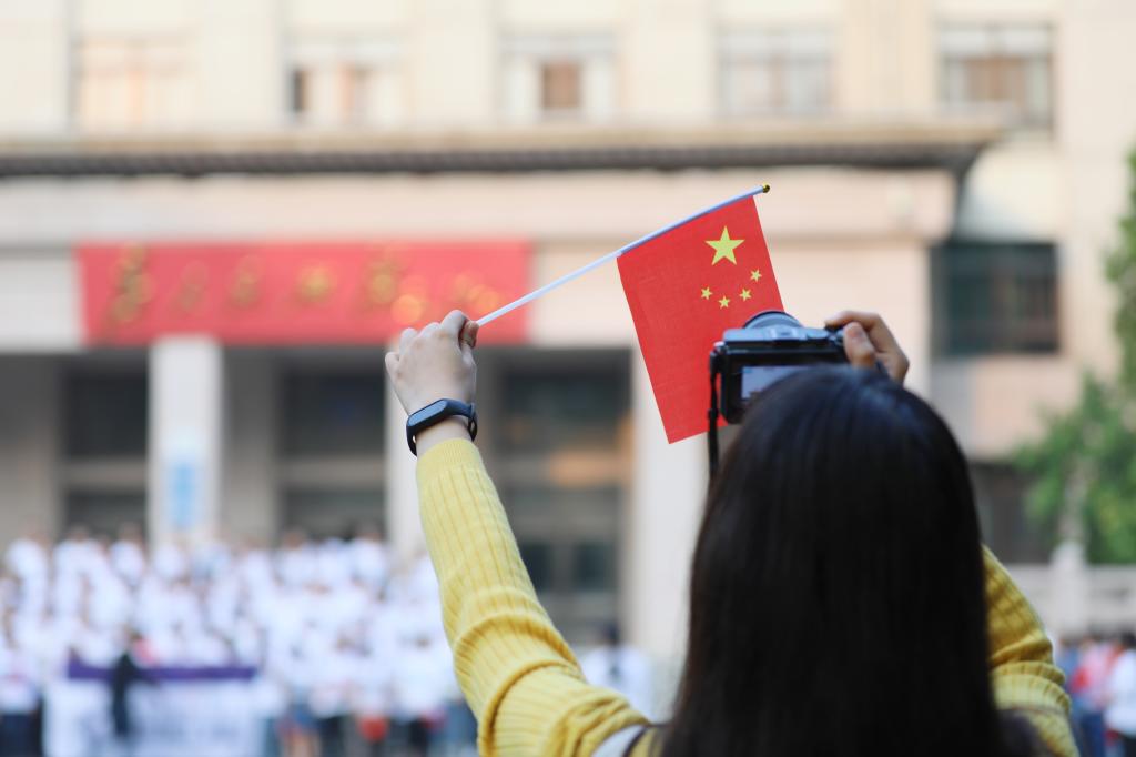 伴随着雄壮的《义勇军进行曲》,鲜艳的五星红旗在现场所有人庄严的注视下徐徐升起、迎风飘扬,嘹亮的国歌响彻校园。