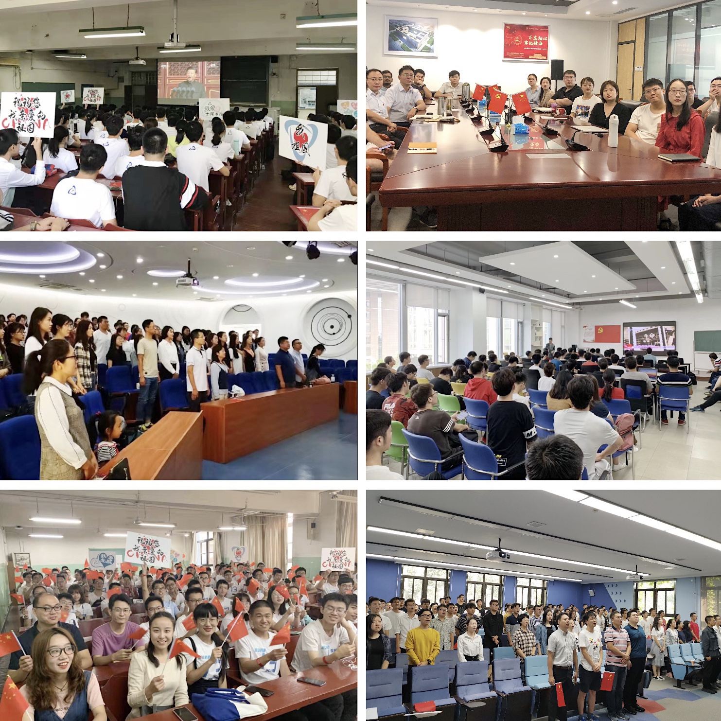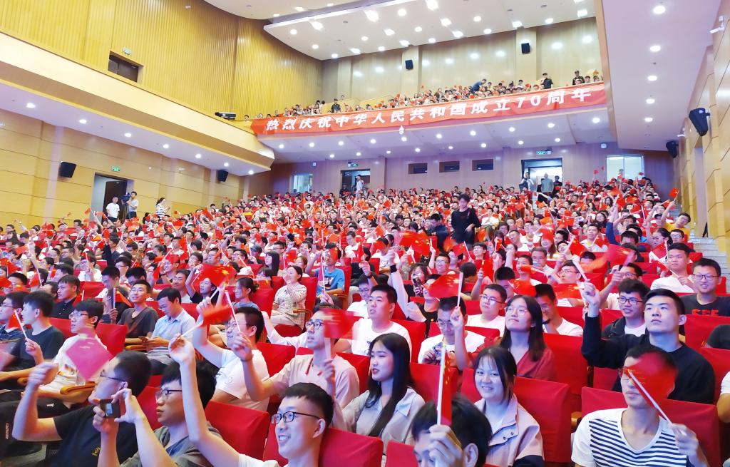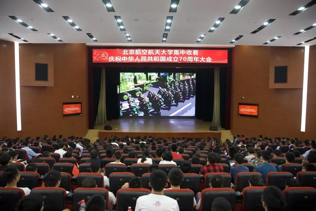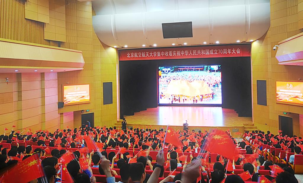 北航新闻网10月1日电(记者 王晴/文 邸白鹭 张展毓 田文浩 李淼/摄影)2019年10月1日,首都各界庆祝中华人民共和国成立70周年大会在北京天安门广场隆重举行,中共中央总书记、国家主席、中央军委主席习近平出席大会并发表重要讲话。在这举国同庆的日子里,北航广大在校师生自行通过电视、网络、广播、手机客户端等,积极收听收看大会直播,学校也在学院路校区晨兴音乐厅和沙河校区咏曼剧场同步设置了直播会场,观看庆祝中华人民共和国成立70周年大会、阅兵和群众游行的直播。