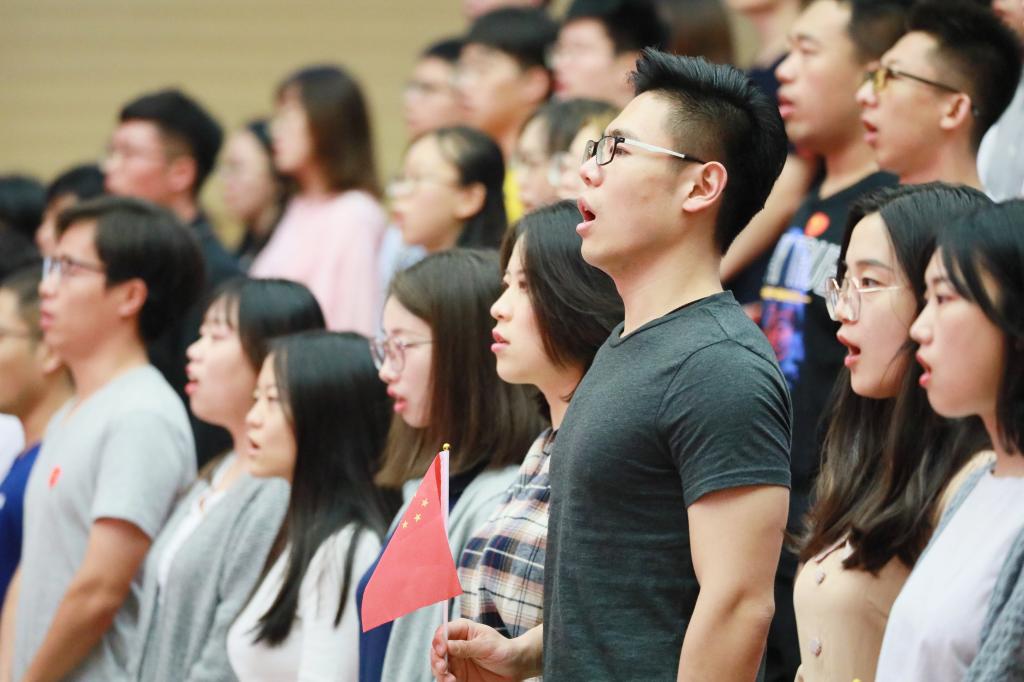 直播会场的师生全体齐唱《义勇军进行曲》