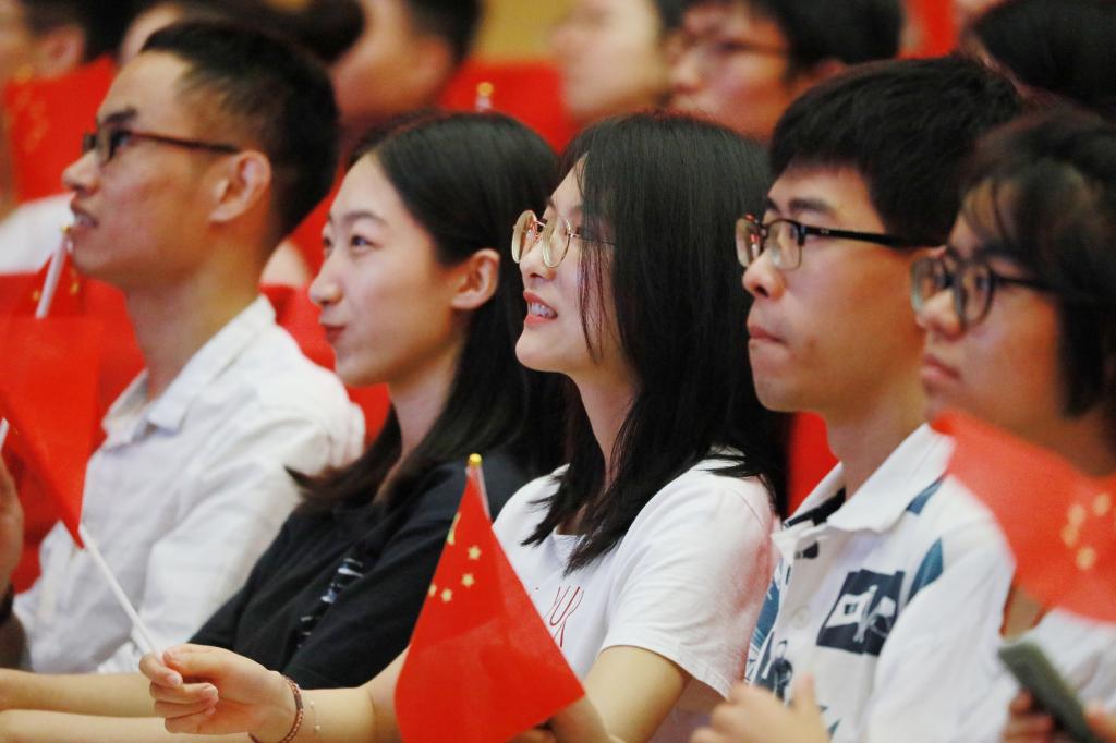 阅兵式正式开始,山河为证、岁月为名,这是一场凝聚民族魂、提振强军志的精彩盛典。一列列整齐划一的方队依次走过天安门进行受阅。他们挥汗如雨、眼神坚定,步履不停、气势磅礴。从雄鹰呼啸苍穹到铁马驰骋长街,随着国庆阅兵式的进行,直播会场不时发出阵阵掌声和欢呼声,特别是当航空航天相关内容出现时,师生们更是无比激动,共同为祖国的辉煌成就鼓掌欢呼。