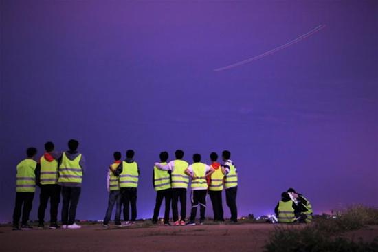 “冯如三号”2号机试飞,科技创新训练营成员在观察无人机航迹。北京航空航天大学供图