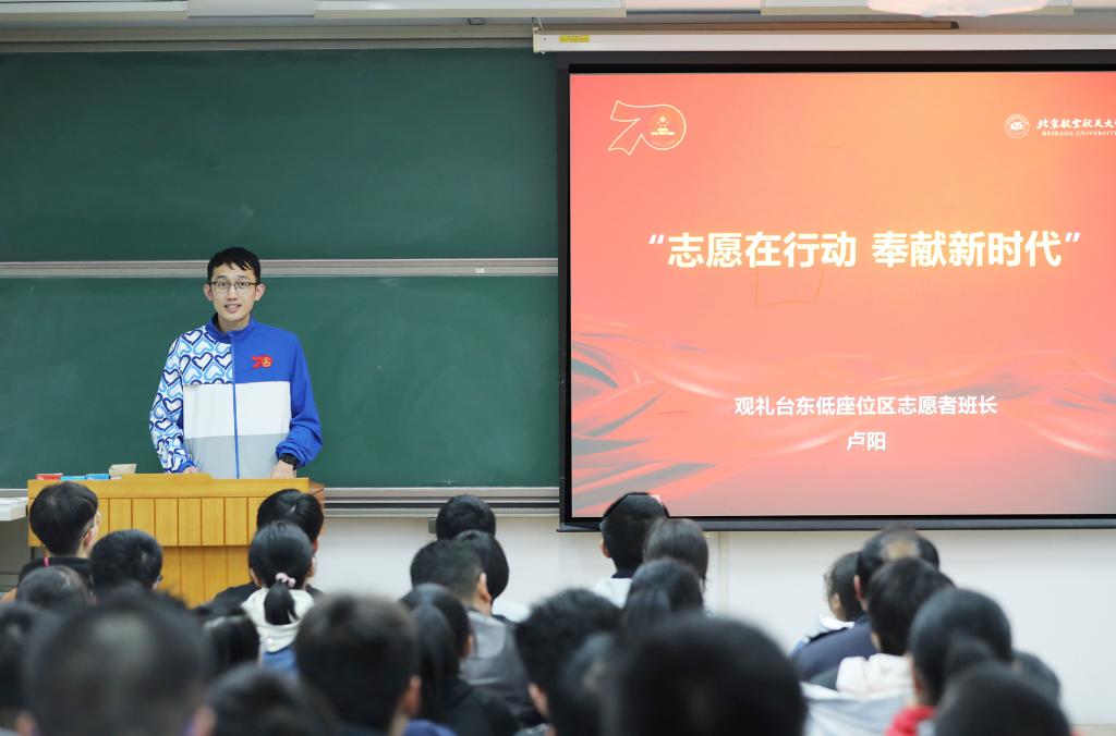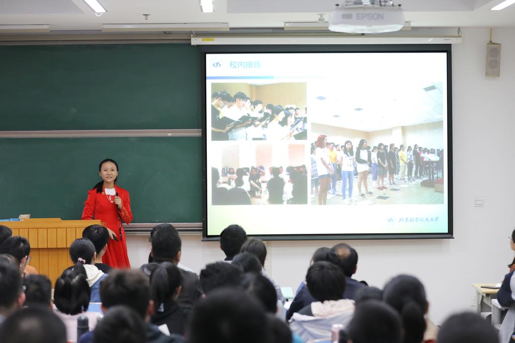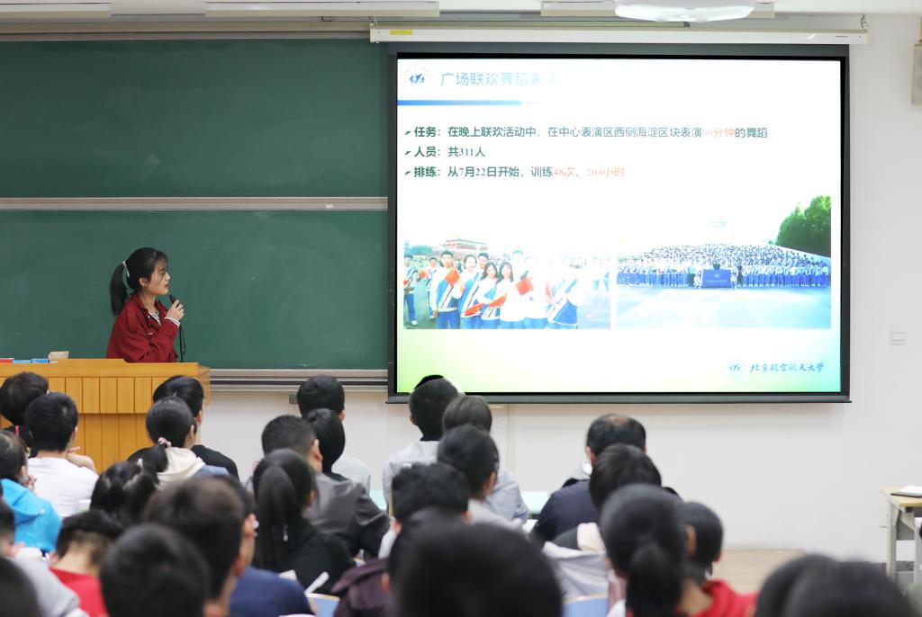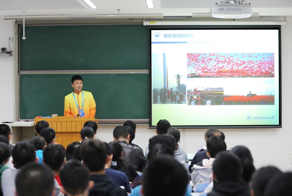 在庆祝新中国成立70周年系列庆?;疃?,北京航空航天大学有4800余名师生参与各类服务保障工作。近期,学校成立“青春与祖国同航”国庆70周年活动参演师生宣讲团,参演师生自愿报名,学校组织面试,选拔出了60名教师和学生,类别涵盖预备役部队方队、群众游行方阵、庆祝大会合唱团、广场群众联欢千人合唱团与舞蹈、志愿者等各类群体。校学生工作部牵头举行三次校内集体备课会,并邀请北航马克思主义学院书记高宁副教授,北京市委宣讲团有关专家现场指导。宣讲团讲述参与国庆活动的亲身经历和真情实感,希望用庆?;疃し⒌娜?、奋斗之情感染更多同学,激发他们传承和弘扬“空天报国、敢为人先”的北航精神。