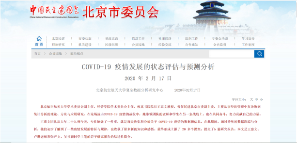 经管学院党政负责人:自新型冠状病毒肺炎疫情以来,经管学院教师把后方当前线,积极献言建策。王惠文教授在这场抗击疫情的战役中,撰写并提交了12篇关于抗击疫情的社情民意信息,被民建中央和中央统战部《零讯》采用。吴俊杰教授带领数据智能课题组联合计算机学院智慧城市课题组,进行建模并完成疫情预测报告上交卫健委和网信办等国家相关部门,为疫情防控提供更好的决策支持。李平教授,通过民建北京市委报送了多份建言献策报告,其中报告《呼吁重视武汉周边城市的疫情防控和医疗援助》被民建北京市委采纳,并报送全国政协。学院与北航深圳研究院联合组织北航“深”音公益在线系列讲座,分析疫情对实体经济、特别是制造业的影响,探讨智能制造在新背景下发展的重要机遇,研究新技术、新模式在制造业的运用和前景。在发出北航“抗疫”声音的同时,经管学院教师积极探索各种线上教学模式,拓展多种形式的授课方式,力争为学生上好课。本学期经管学院共有103门本科生课程、96门研究生课程采用在线授课的方式完成。在抗击“新冠疫情”的战斗中,学院教师身体力行践行了教书育人、科研报国的北航情怀。