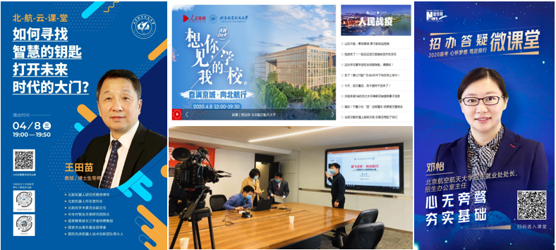 在招生工作方面,探索打造融媒体模式下的立体招生宣传新模式。打造“北航云课堂”,探索面向中学及考生的在线讲座及课程点播、在线资源推广和运用新方式,目前已完成课程录制13场,播放3场,场均17000余人次观看;发布12期“来北航,学这个”系列学院专业介绍微信推送,方便考生了解我校专业;30个招生工作组全部设立招生咨询QQ群,线上实时为考生和家长答疑解惑;与人民网联合实施“春满京城·向北航行”校园慢直播活动,累计观看量267万人次;开设“北航招生”抖音、哔哩哔哩、腾讯课堂账号,全方位宣传北航招生工作动态;上线北航招生在线咨询系统,招生政策、各省招生计划、历年分数等一键获取,“北航小智”可提供7*24小时智能在线咨询,上线后已提供智能咨询服务1000余条。