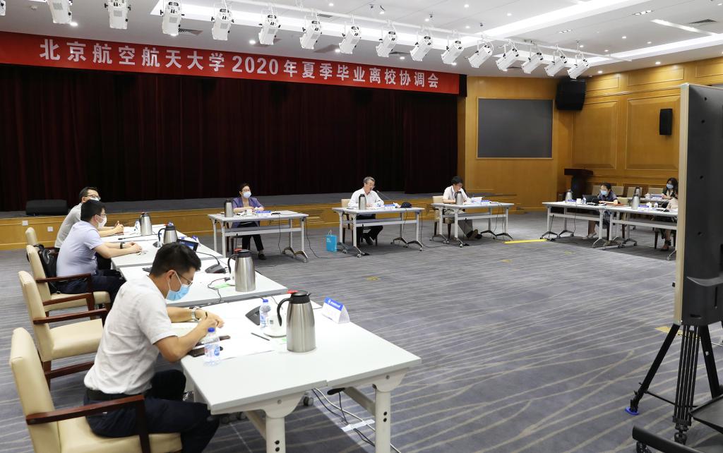 北航新闻网6月6日电(通讯员 王扬/文 记者 邸白鹭/摄影)6月5日下午,我校召开2020年夏季毕业生离校工作协调会,副校长黄海军,研究生院、招生就业处、党政办公室、宣传部、学生处、安全保卫处、教务处、财务处、后勤保障处、信息化办公室、体育馆、档案馆、图书馆、校医院等单位负责人在如心会议中心大报告厅参加现场会议,各学院党委副书记、研究生指导主任、毕业班辅导员、教学秘书、保密管理员等在学院视频会议点参加视频会议?;嵋橛裳芯可核蜗鞒?。