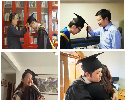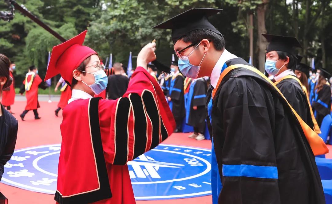 在现场,校领导为68名毕业生一一拨苏正冠,屏幕前,父母、长辈也为北航学子们完成拨穗礼,深情拥抱,五湖四海的北航学子在同一时间完成扶苏正冠。