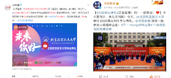 据悉,毕业典礼通过人民日报、央视新闻、北京日报、学习强国、微博、抖音、B站、快手、央视频、百度等各大网络平台同步直播典礼全程,总观看人数超过200万,“云端”见证2020届北航学子青春风采,共同庆祝和铭记这个特别的日子。