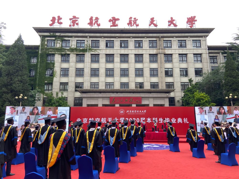 8点,在北京航空航天大学的主楼广场上,伴随着激昂的乐曲,2020届本科生毕业典礼暨学位授予仪式正式举行。除了现场68名本科毕业生代表,身在祖国各地的3400多名北航毕业生,与家人亲友、母校一起,共赴这场“云端”之约,以这种特别的形式为大学生活作结。