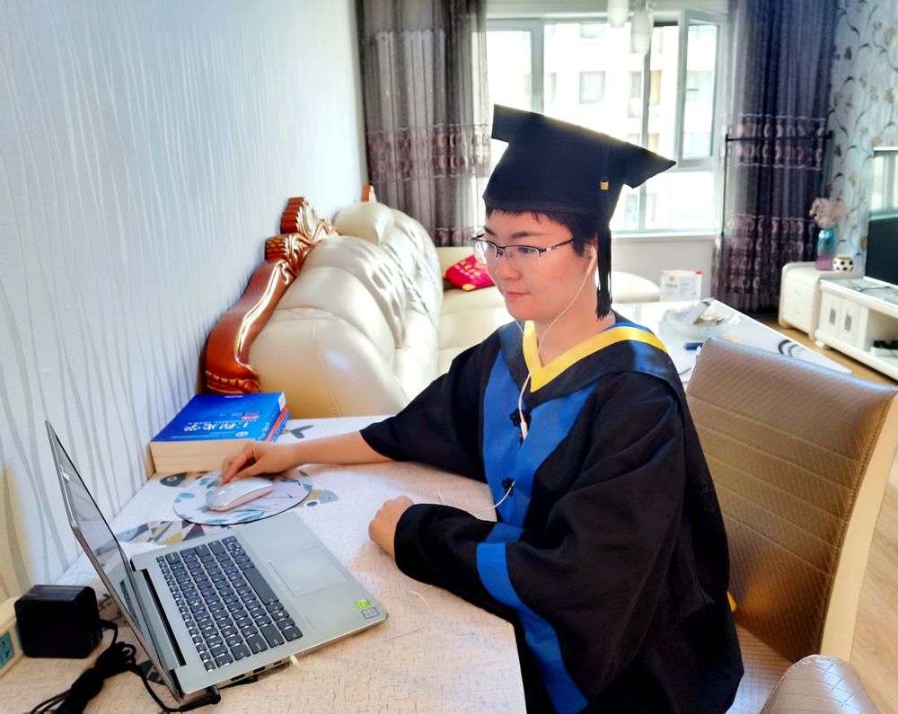 北航电子信息工程学院毕业生董甜在家中观看毕业典礼。