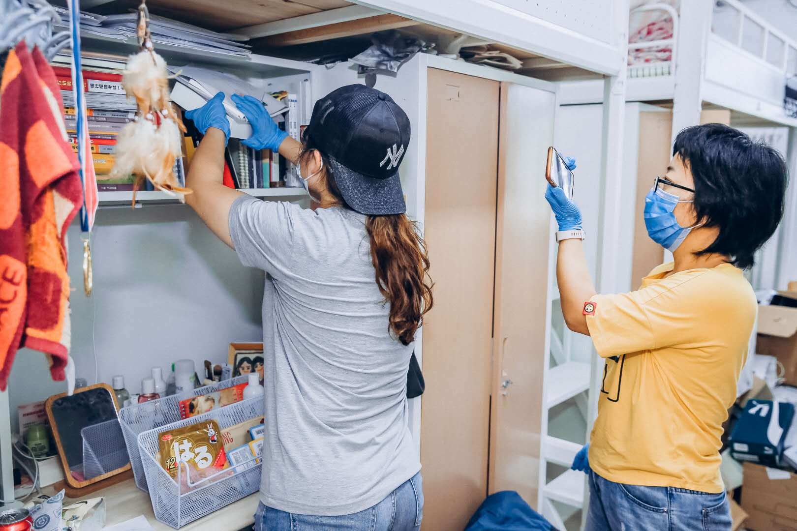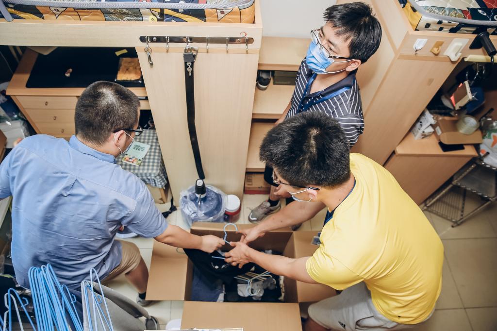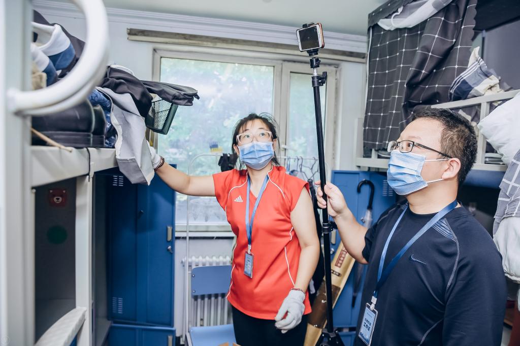 从宿舍门前的晾衣架,到抽屉里的大小物品;从桌子上的纸巾茶杯,到衣柜里的过冬衣物;从床铺上的枕巾被褥,到板凳上的小小坐垫……打包全程视频连线,按照类别一一装箱,随后统一交给快递公司邮寄。