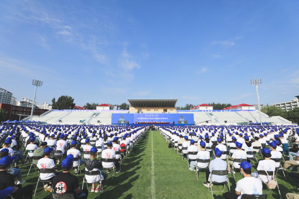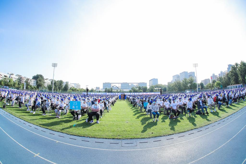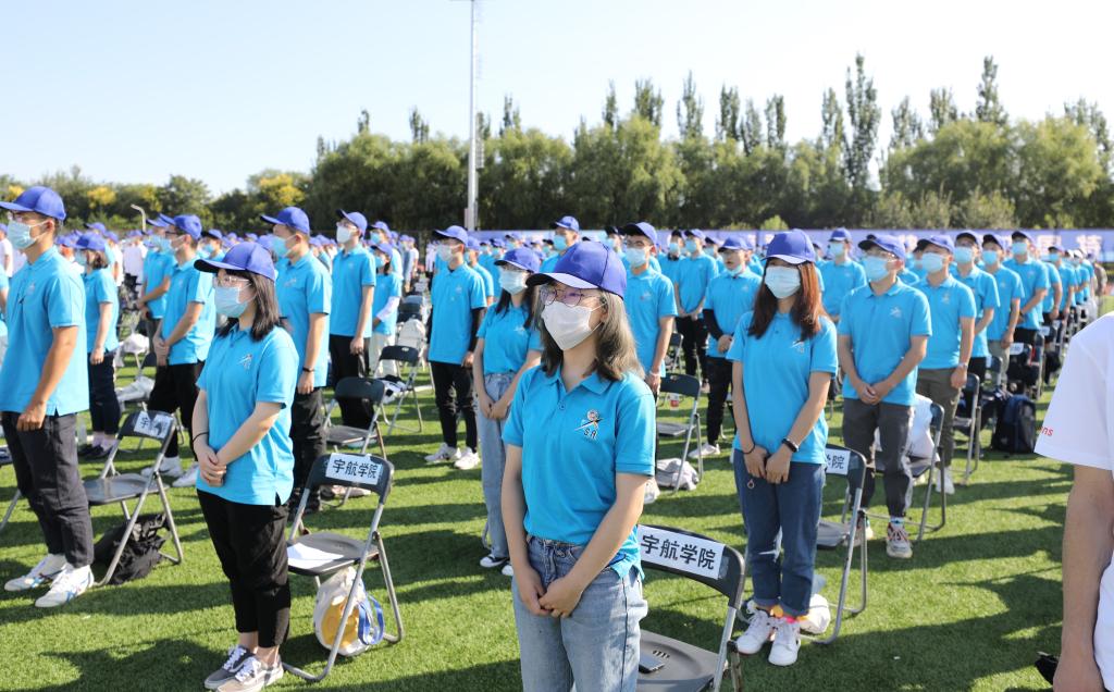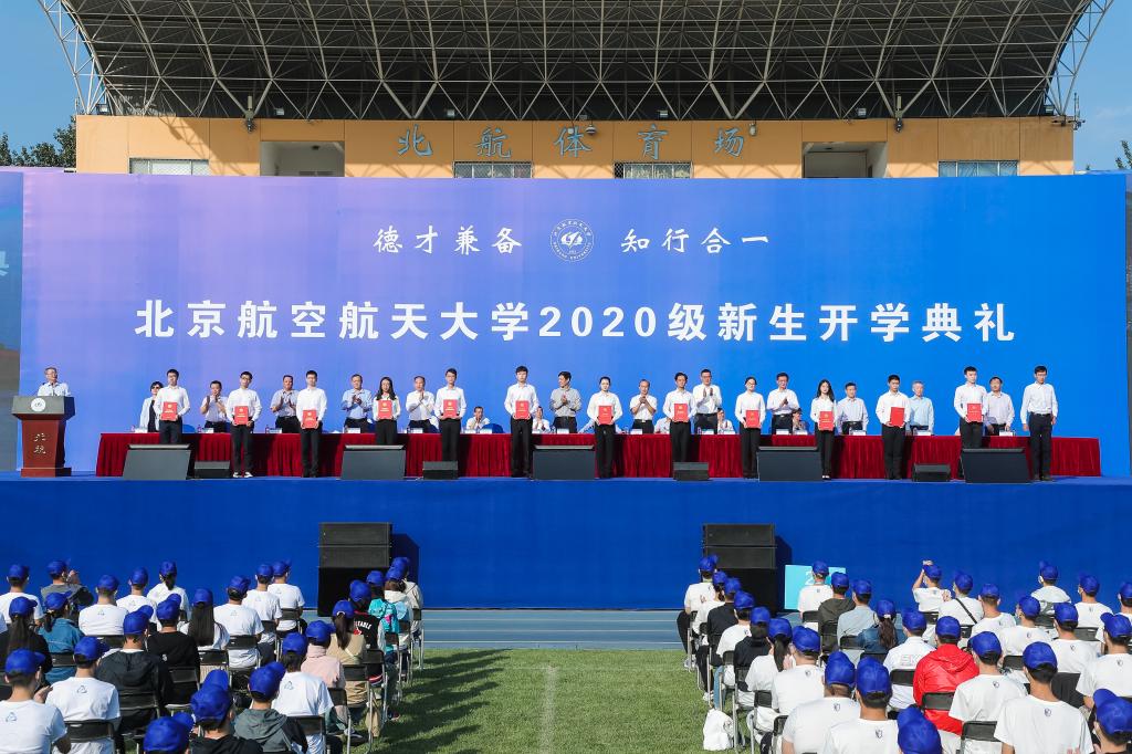 两校区宽阔的体育场上,蓝白两色交叉组成“I?BUAA”的巨幅醒目图案,表达新生对学校的真挚情感;主席台正上方悬挂着“北京航空航天大学2020级新生开学典礼”长条横幅,左右两边矗立着两块巨型屏幕,用以播放学校为新生精心制作的视频和两校区典礼直播盛况。