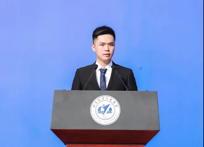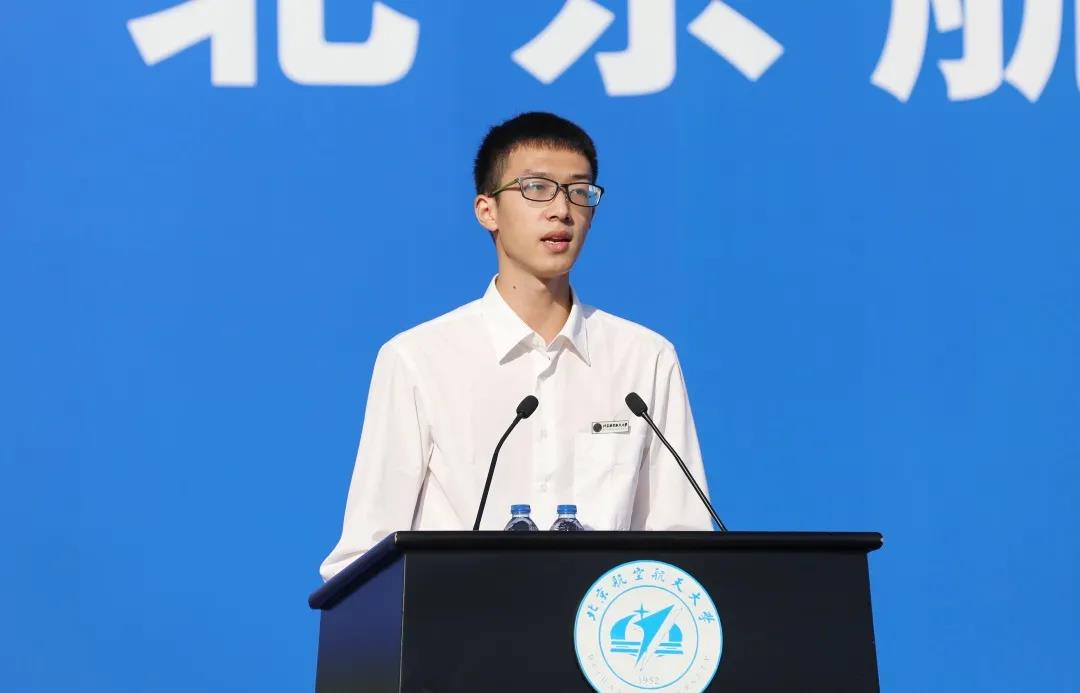 在开启新征程之际,来自守锷书院的2020级本科生苏祺乐同学作为本科新生代表发言,苏祺乐是一名武汉考生,父母都是抗击疫情的一线警察,他在典礼上与大家分享了对崭新大学生活的向往和为祖国航空航天事业贡献力量的笃定与执着。