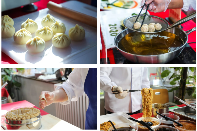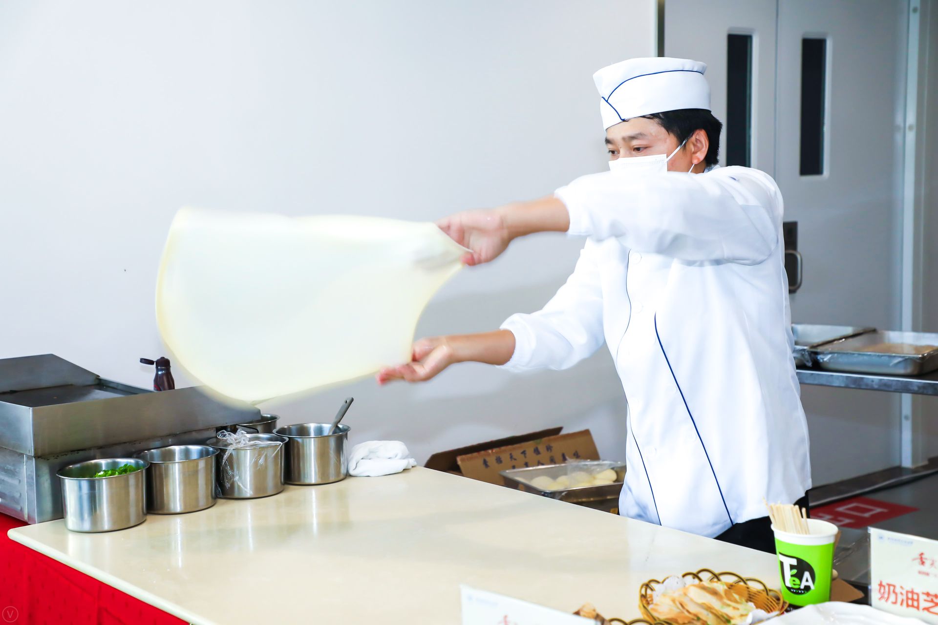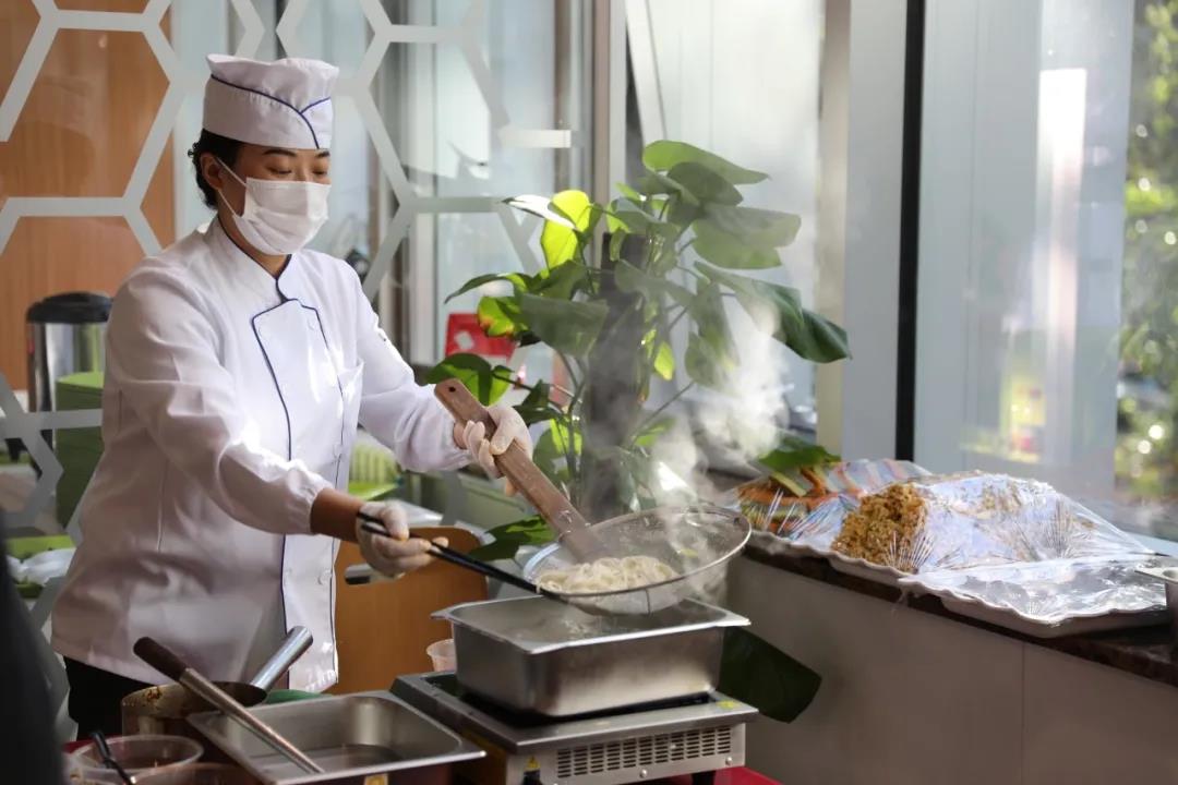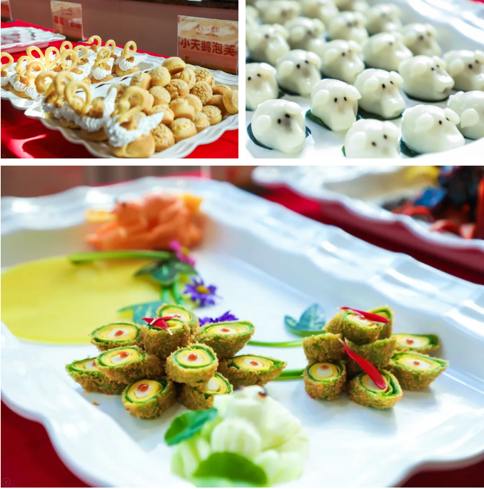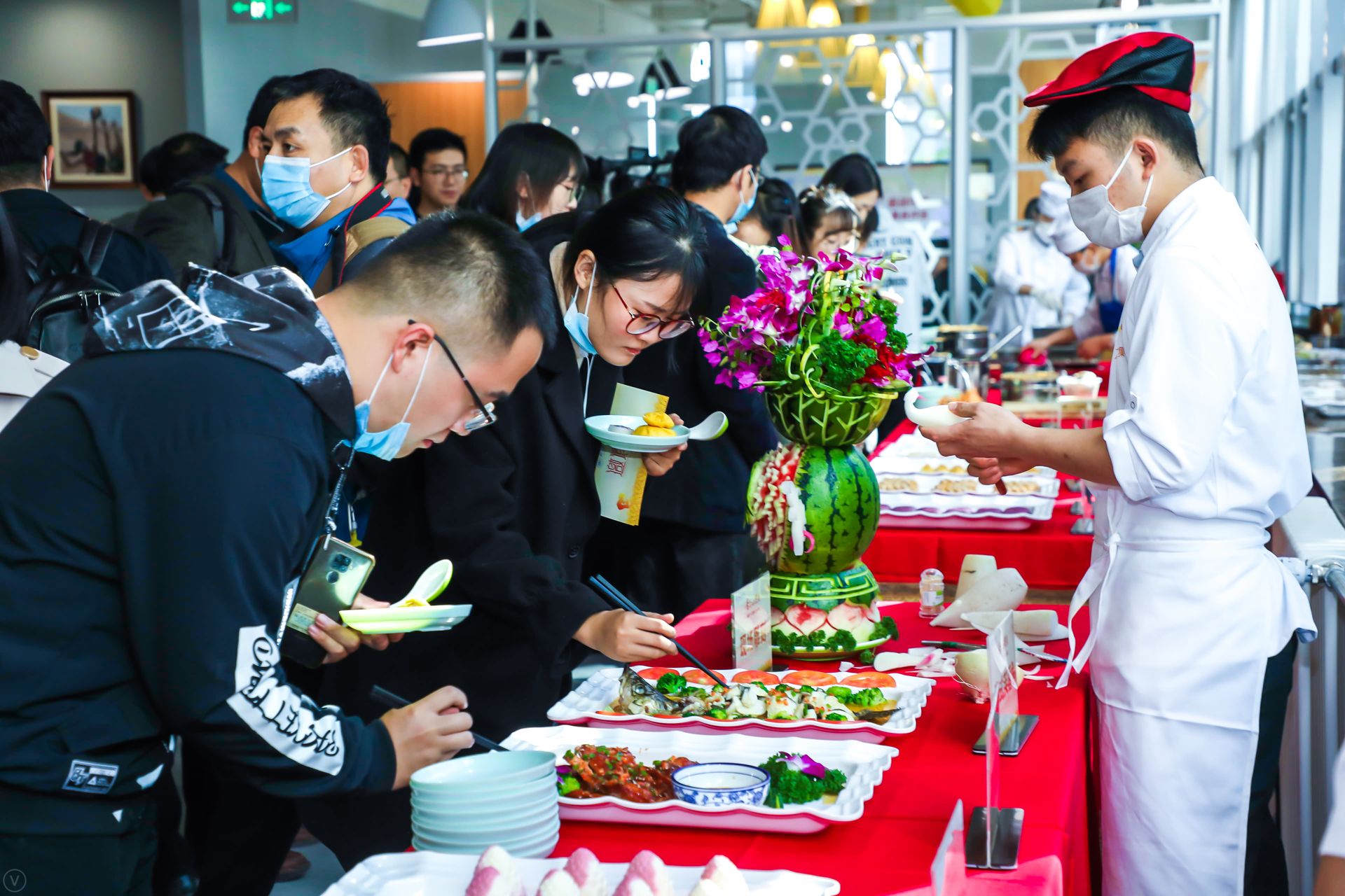 活动中,各位大厨纷纷亮出拿手绝活,整个现场美食飘香,气氛热烈。厨艺体验区和航味菜展示区,果仁糯米糍、翡翠白玉扇、金蟾望月、现场雕刻……多种创意菜品和风味小吃,品种丰富、造型各异,展现出厨师们娴熟的烹饪技艺,让人大快朵颐、赞叹不已;互动体验区内,提褶包子、抛饼、拉面……大厨与现场师生共同制作出一道道鲜香四溢的精美美食。