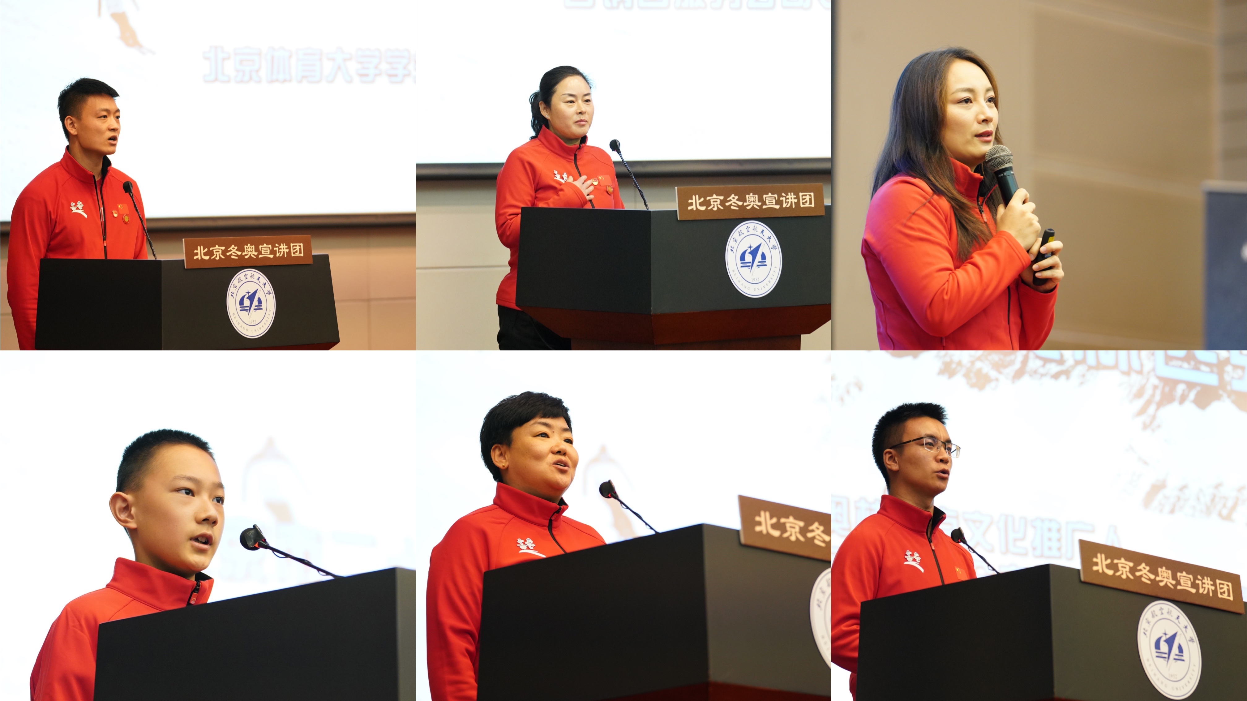 北京冬奥组委工作人员许丹丹对2022年冬奥会和冬残奥会筹备工作整体情况做了介绍。随后,平昌冬奥会闭幕式“北京八分钟”轮滑演员郭露阳、冬奥组委办公区讲解员姜金玉、自由式滑雪空中技巧世界冠军李妮娜、获全国青少年冰球锦标赛U12组第一名的小学生黄诗瑞、推动全民健身活动的奥林匹克社区人郝涛、访遍奥运会主办城市的奥林匹克文化推广者侯琨等6位宣讲员进行宣讲。他们不凡的奥运经历和真挚朴实的奥运情怀,让现场学生深受鼓舞,赢得了同学们的阵阵掌声。
