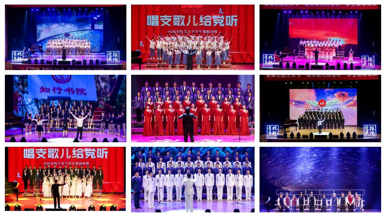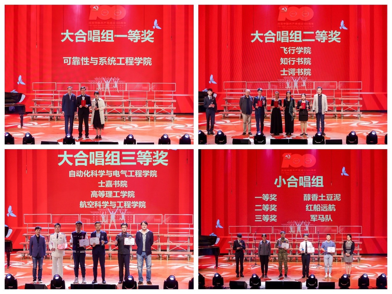 决赛在开场快闪《唱支山歌给党听》中拉开序幕。士谔书院清新改编的歌曲《彩虹》表达他们无惧风雨向着天边的彩虹勇敢前行,自动化科学与电气工程学院秉承驭远精神唱响原创曲目《蓝天之梦》,士嘉书院用朝气蓬勃的歌声唱起《太行山上》,知行书院以《我们都是追梦人》表达他们的热爱与信念,高等理工学院一首《我爱你中国》唱出心中的热爱,飞行学院以学生作词作曲的《红》表达他们逐梦蓝天的信心,可靠性与系统工程学院以一首《南泥湾》展示青春风采,航空科学与工程学院的双学籍飞行员铿锵有力的唱响《强军战歌》。八支队伍演绎经典红色旋律,引导广大师生在歌声中感悟党史,在律动中坚定信仰。第二轮的必选曲目中,每支队伍都唱起了《没有共产党就没有新中国》,最终可靠性与系统工程学院经过两轮比拼最终夺得冠军,飞行学院、知行书院、士谔书院获得二等奖,自动化科学与电气工程学院、士嘉书院、高等理工学院、航空科学与工程学院荣获三等奖。在小合唱组的比拼中,醇香土豆泥夺得冠军,红船远航和军马队位列二三名。在三个单项奖的角逐中,知行书院获得最具创意奖,自动化科学与电气工程学院获得最佳人气奖,飞行学院荣获最佳组织奖。