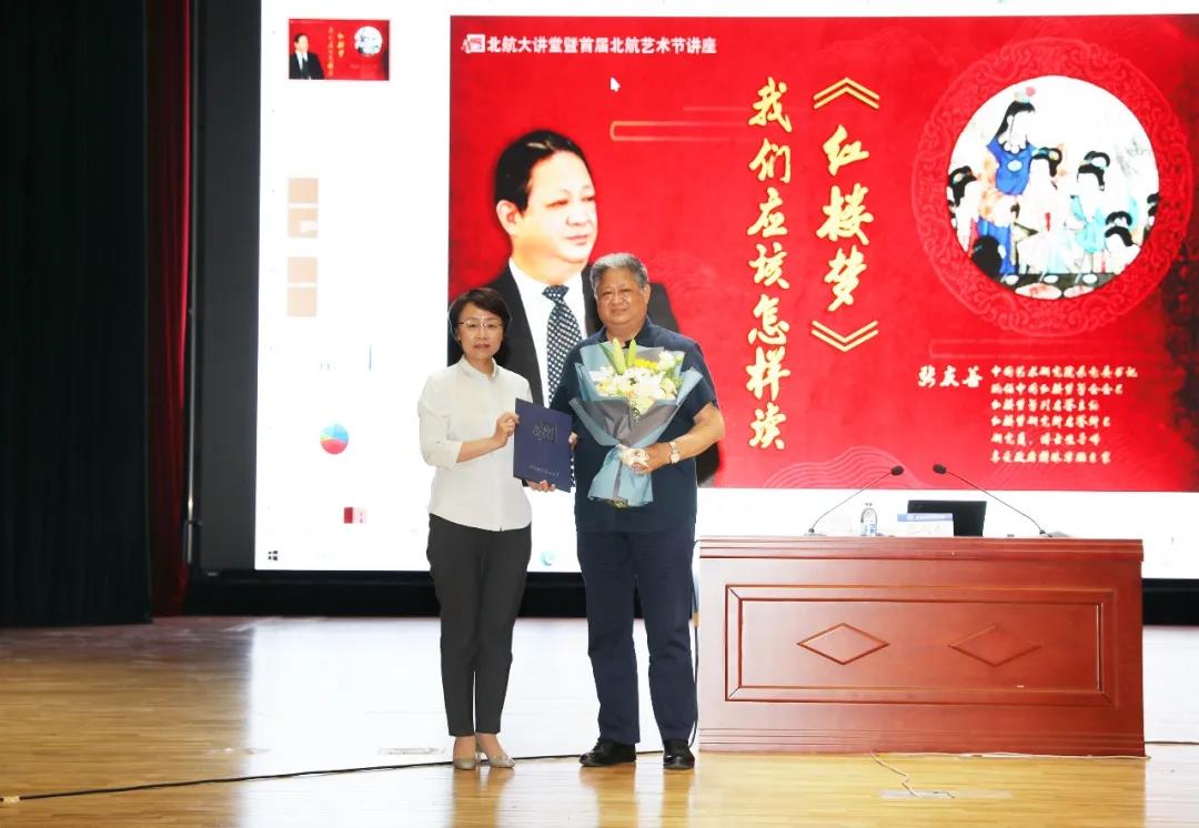 讲座上,曹淑敏为张庆善颁发“北航大讲堂”荣誉证书。