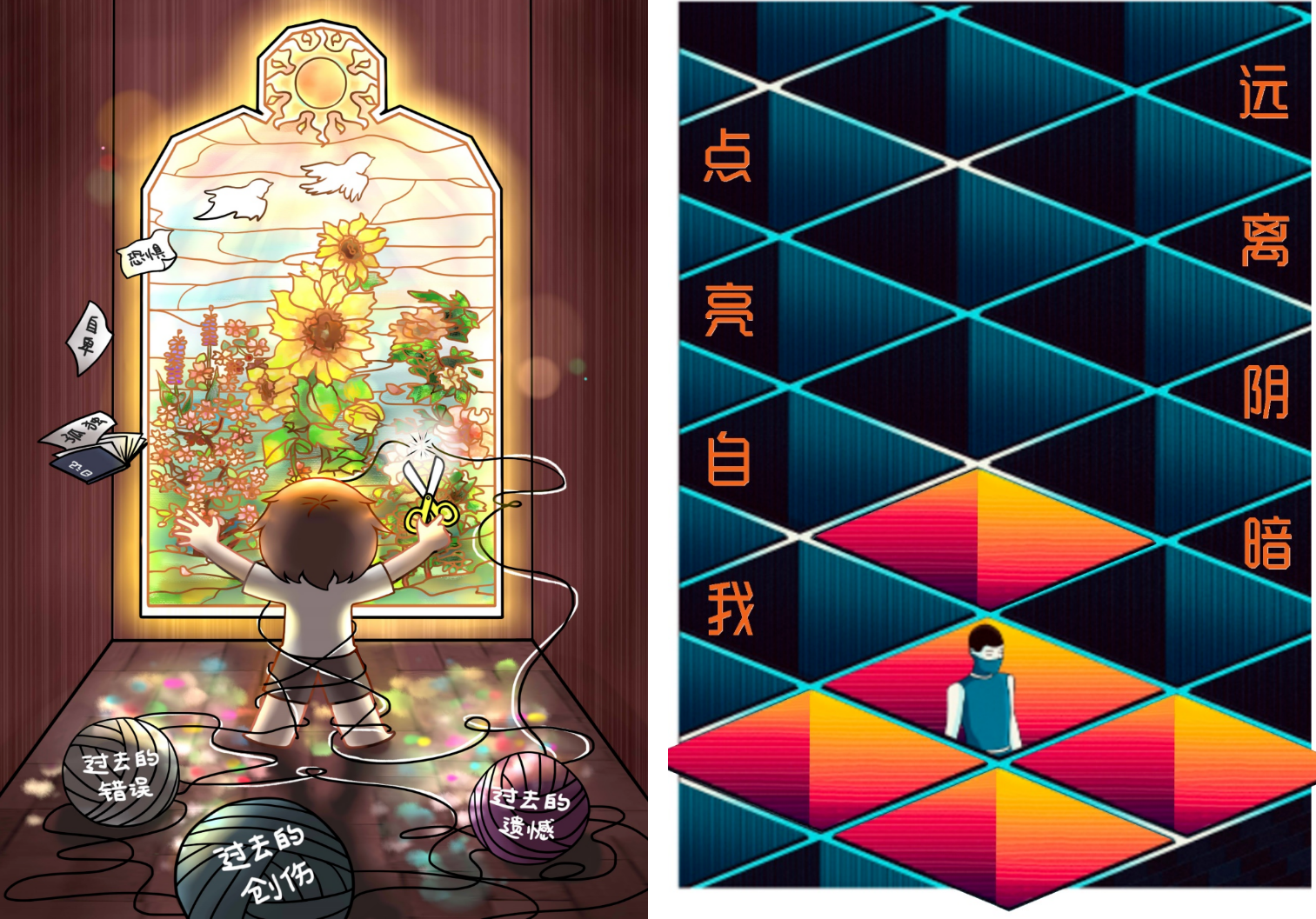 左:二等奖:曹瀛予《面向阳光,只差一个转身》;右:二等奖:沈?!兜懔磷晕?远离阴暗》