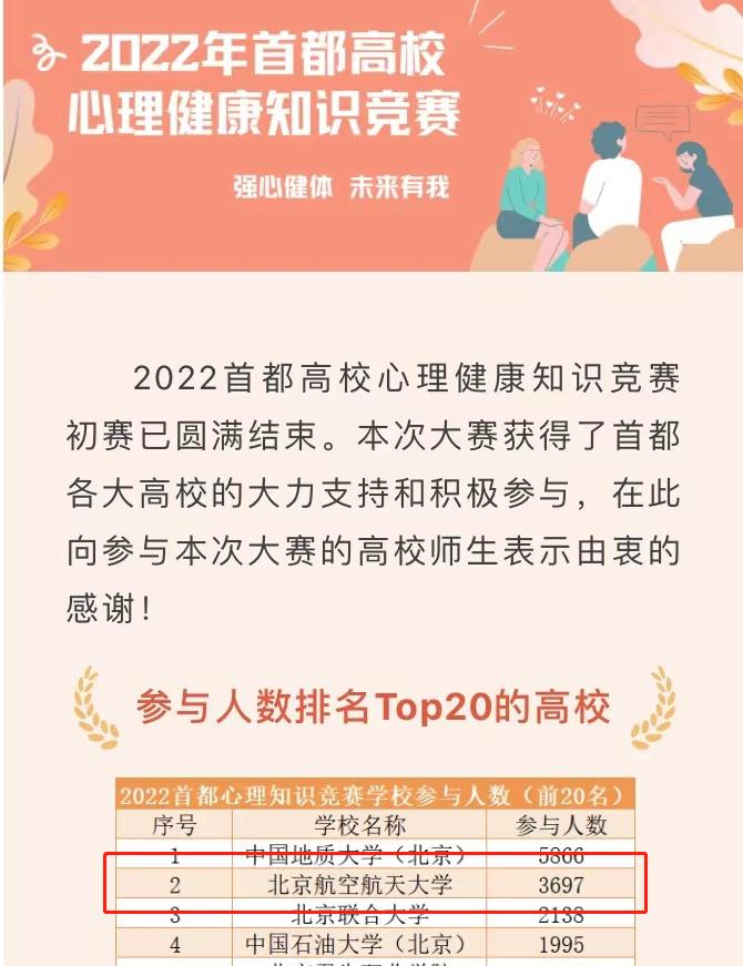 疫情期间,关怀帮扶一直在。日常工作,全心全意爱学生。近日,北航第29届大学生心理健康节圆满落幕,今年的活动以“强心健体 未来有我”为主题,让同学们充分学习北京2022年冬奥会和冬残奥会中拼搏、勇敢、自信、阳光的体育运动精神,不断提高心理素质,勇于担当成为面向未来的社会主义新时代建设者和接班人。