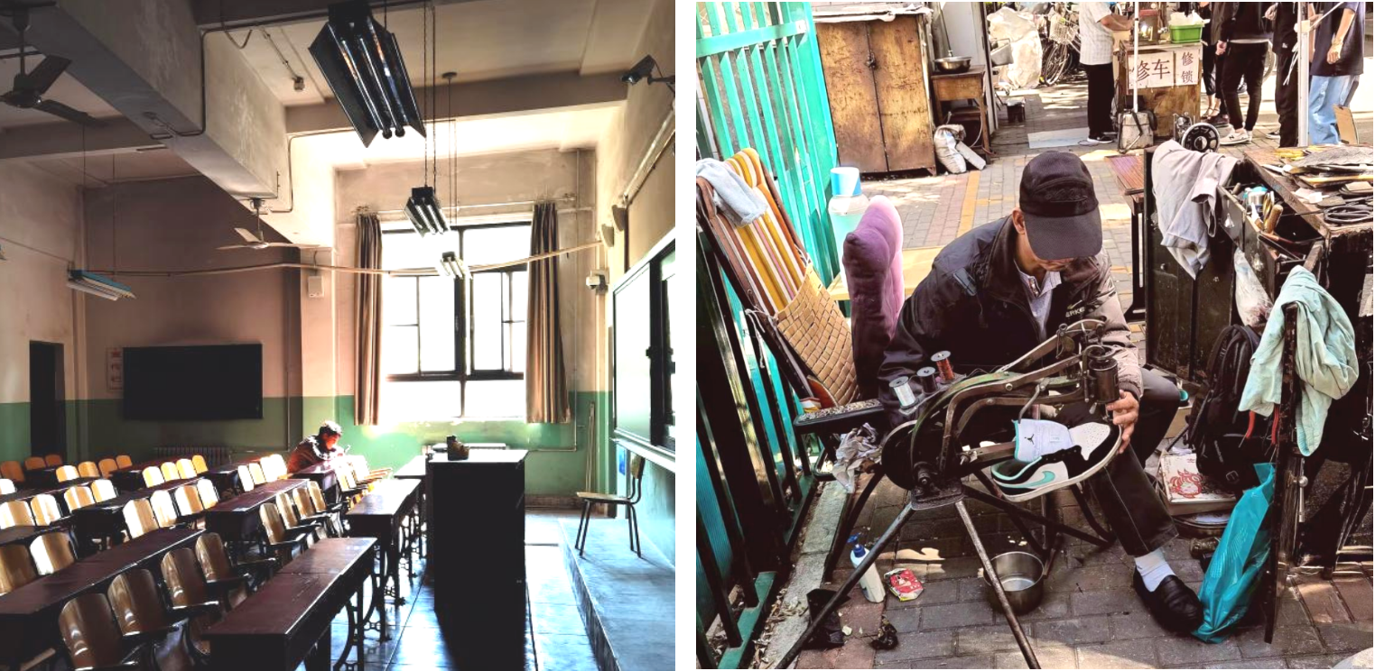 左:教室独自学习的同学;右:劳动节的修鞋师傅