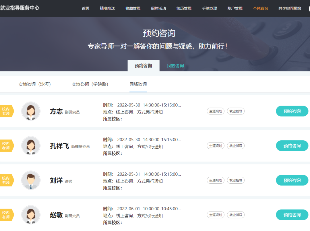 在个体咨询??榭汕逦榭吹际α斜?,点击导师头像了解导师专长,结合自身需求随时预约。职业发展个体咨询预约:详情请见北航就业资讯网“个体咨询”栏目。