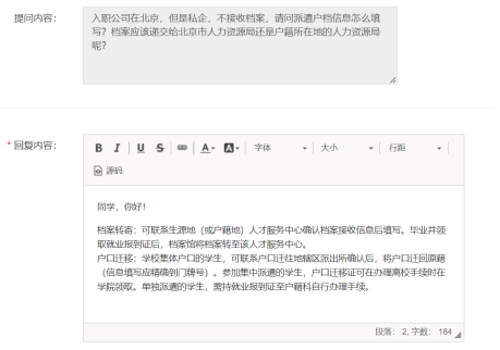 线上咨询业务全面开通,进一步优化毕业生就业手续办理和政策问题的咨询服务,智能咨询提供常见问题的解答,对于个性化问题,使用在线提问功能,由老师进行针对性解答,精准回复。