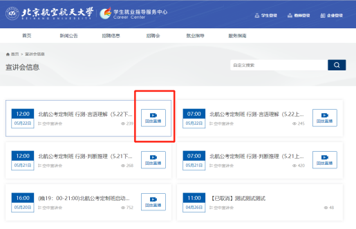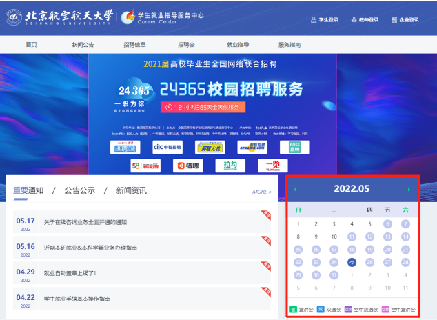 招聘安排早知道,重要活动不错过。为了提醒同学们各种招聘安排和活动,在北航就业资讯网和微信端平台显眼处可见“招聘日历”模块,关注空中宣讲会、空中双选会……提前掌握招聘安排,招聘活动不断线。如果错过空中宣讲会,还可提供7日内回放服务(限校内平台举办的场次)。