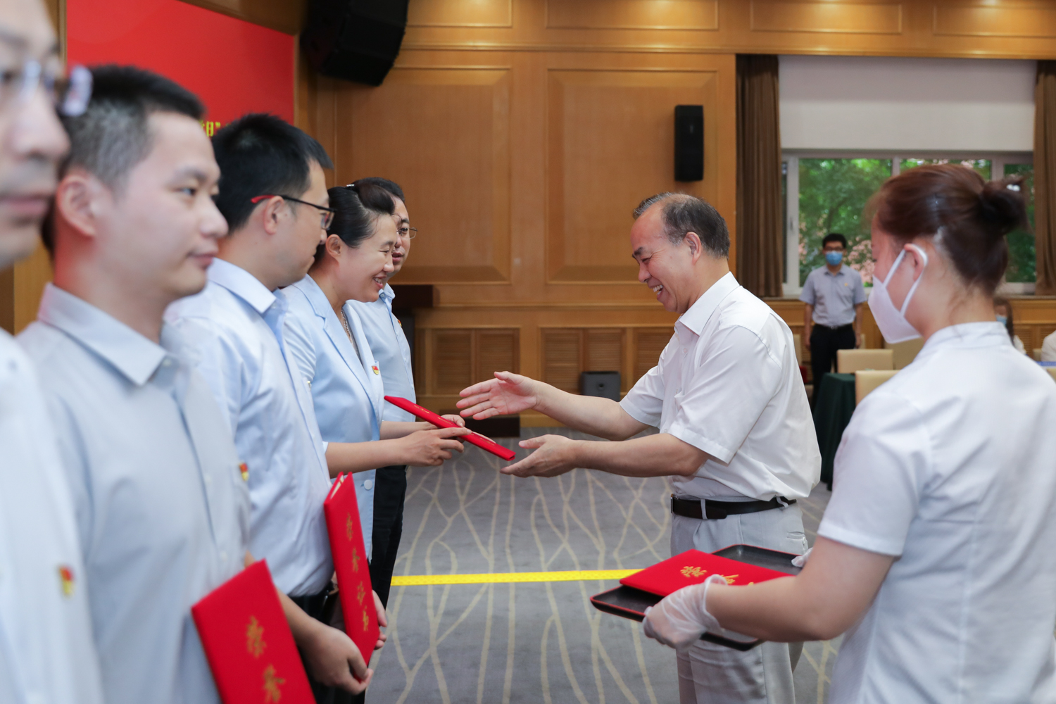 党委副书记程波为获奖单位颁发“党旗在疫情防控一线高高飘扬”优秀主题党日活动证书。